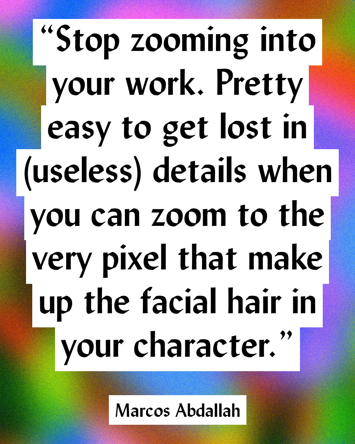 “A simple tip that you probably heard before: Stop zooming into your work. Pretty easy to get lost in (useless) details when you can zoom to the very pixel that make up the facial hair in your character.” — Marcos Abdallah
