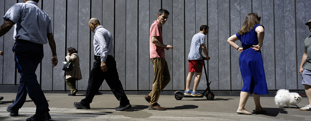“I place my camera beside me on a public bench or table–in plain sight but mostly unnoticed–and take thousands of photographs and compile them into a kind of still time-lapse, an hour condensed into a single panoramic image. The technique is a way for me to make jokes, quips, and comments in the process of rearranging time and space. I get excited when a mysterious alchemy arises, neither wholly fact nor wholly fiction–a new subjectivity that sees the world as ideal, tragic, and comic all at once.”