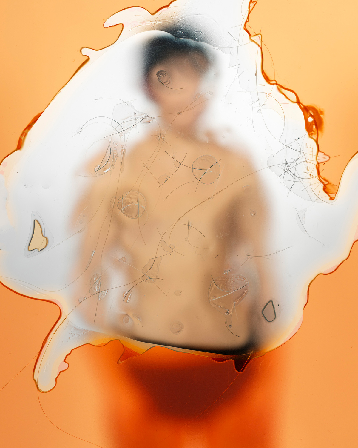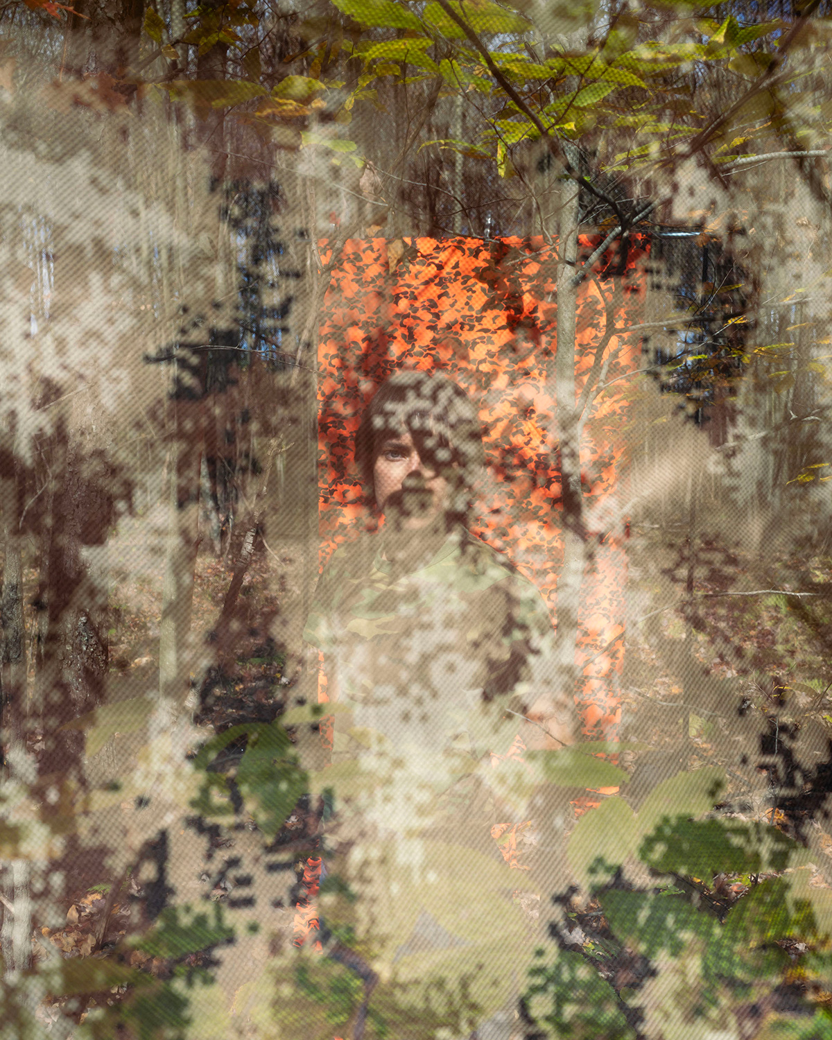 “Throughout the series, I reflect on the patriarchal structures I was raised within to explore my relationship with masculinity. I use personal artifacts such as hair, hunting trophies, testosterone, and family photographs to trace my relationships and history. In making each portrait, I undergo transformations to question how I dismantle, uphold, or complicate the patriarchal ideologies embedded within American culture. Using self-camouflaging techniques borrowed from military and hunting culture, I investigate the visibility of my identity as a transmasculine person, exploring the constraints of assimilation and imagining new possibilities for masculinity. Rather than deploy camouflage as a tool to disappear into an environment, I use it to become hypervisible, confronting the viewer with the expectations and limitations placed on gender presentation.”