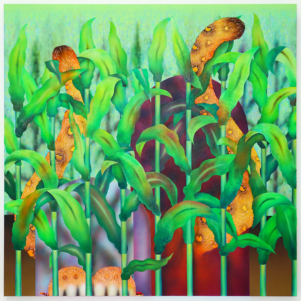 A series of paintings exploring identity and belonging by artist Su A Chae. Chae holds a BA and MA in Business from Ewha Womans University in South Korea. After relocating to the United States, Chae transitioned to the arts, earning her MFA in Painting from Indiana University. She is currently an Assistant Professor of Painting at the University of Arkansas. One of the ideas Chae encountered in accounting academia related to information asymmetry and moral hazards. Her interest in how systems manage asymmetry and visibility has carried over into her painting. For Chae, balance is a site of resistance rather than neutrality. Creating paradoxical spatial propositions and working with contextual ambiguity, Chae creates a visual field that is simultaneously familiar and unsettled.