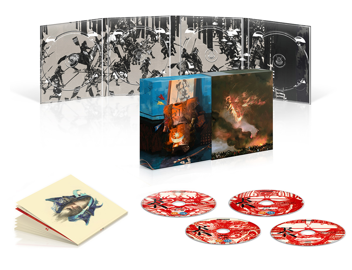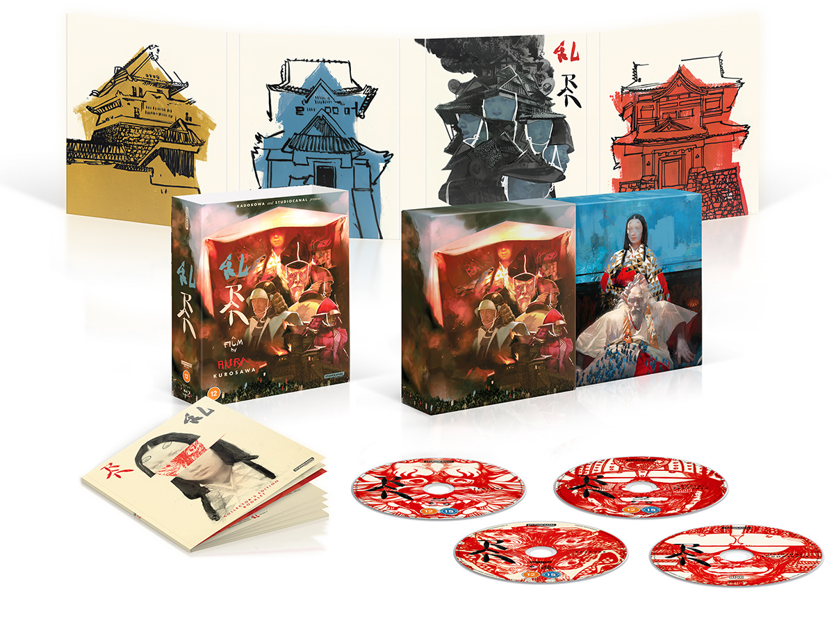 The castles shown in the digipak serve as the central concept. Each panel is a depiction of Lord Ichimonji’s castle and is painted in a primary color representing one of the three son’s armies. I imagine this as a freestanding cube in the final presentation. Each layer of the packaging from the outer slipcase, inner slipcase, booklet, posters to the digipak reference Lord Ichimonji’s descent into madness.