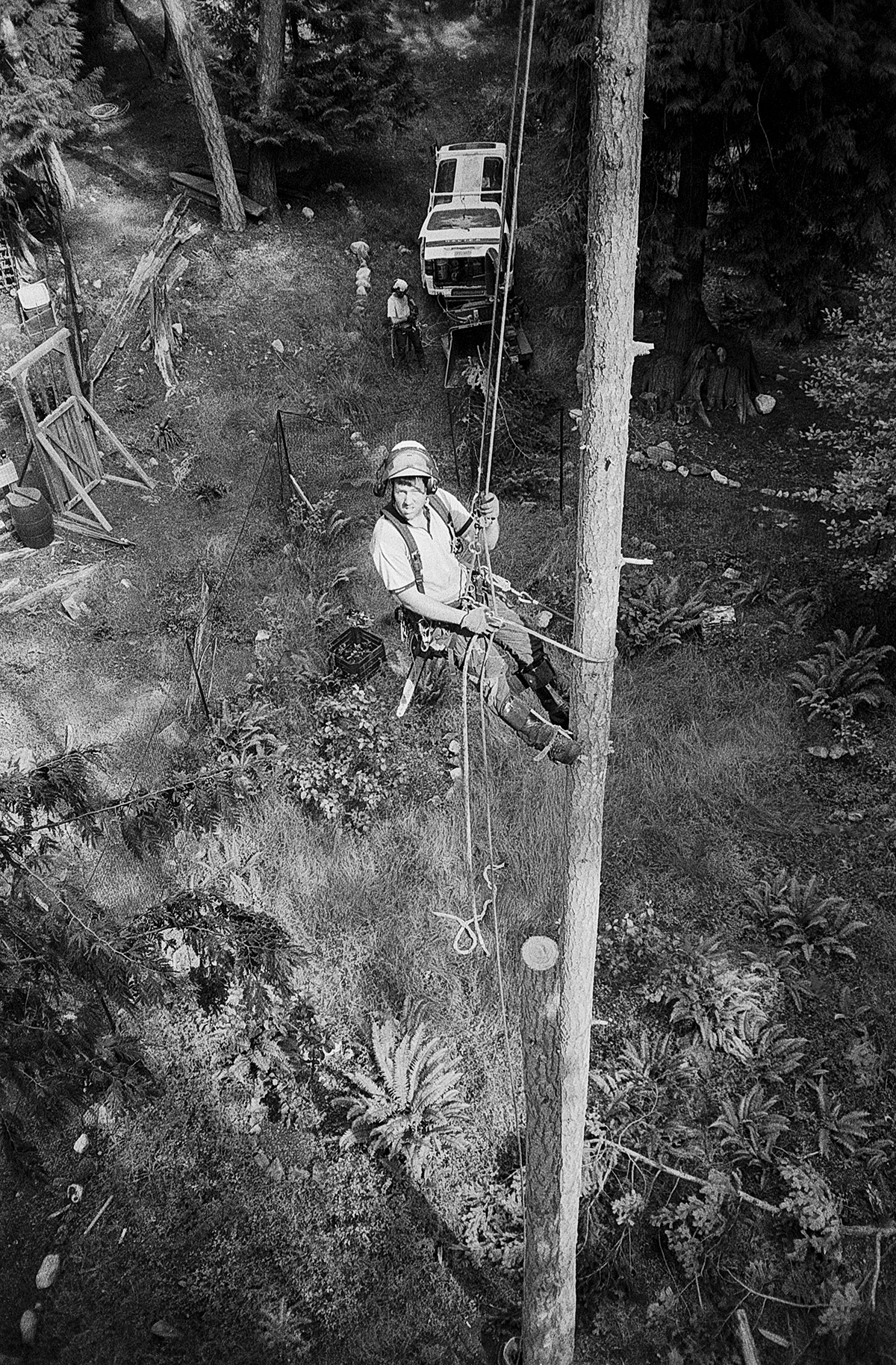 A selection of new work from photographer and printmaker Reave Dennison. Dennison documents maritime and forestry labour in British Columbia. “Tree Work” presents images taken over the past five years while Dennison worked as a log salvor and arborist. The 29 silver gelatin prints portray the environments, people, culture, and technical craft of labour associated with living in the Pacific Northwest. The project will be on display at Pale Fire (870 East Broadway, Vancouver) starting March 19th. Pale Fire will also release Dennison’s first photography book, Under 60 Tons. Co-designed and co-produced with Information Office, the book features over 90 tritone images that Dennison took while working as a crew member aboard small, versatile tugboats, which are classified as “under 60 gross tons.” Under 60 Tons is supported by the Canada Council for the Arts, British Columbia Arts Council, John & Helen O’Brian, Jane Irwin & Ross Hill, and Claudia Beck. “Tree Work” runs until May 9.