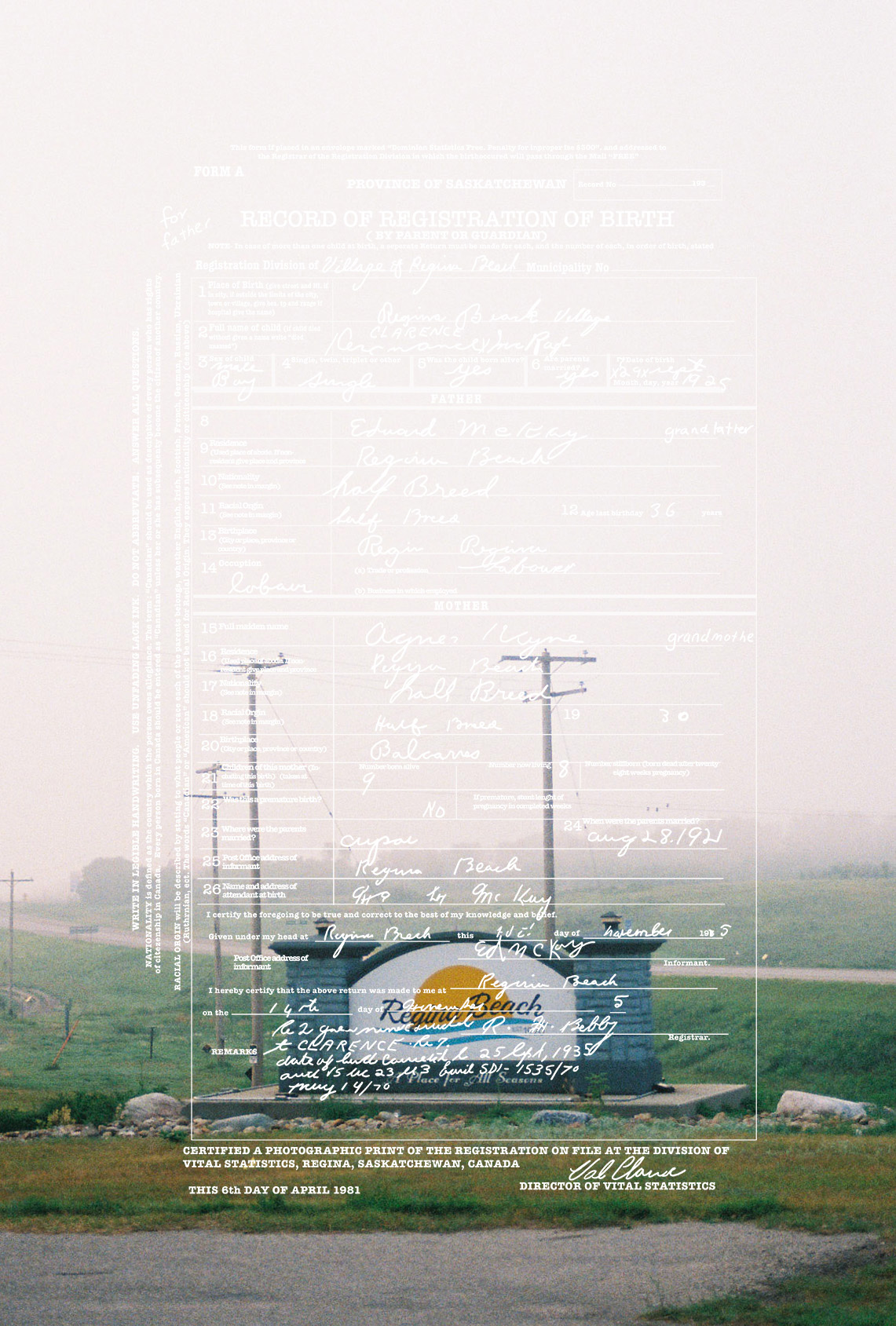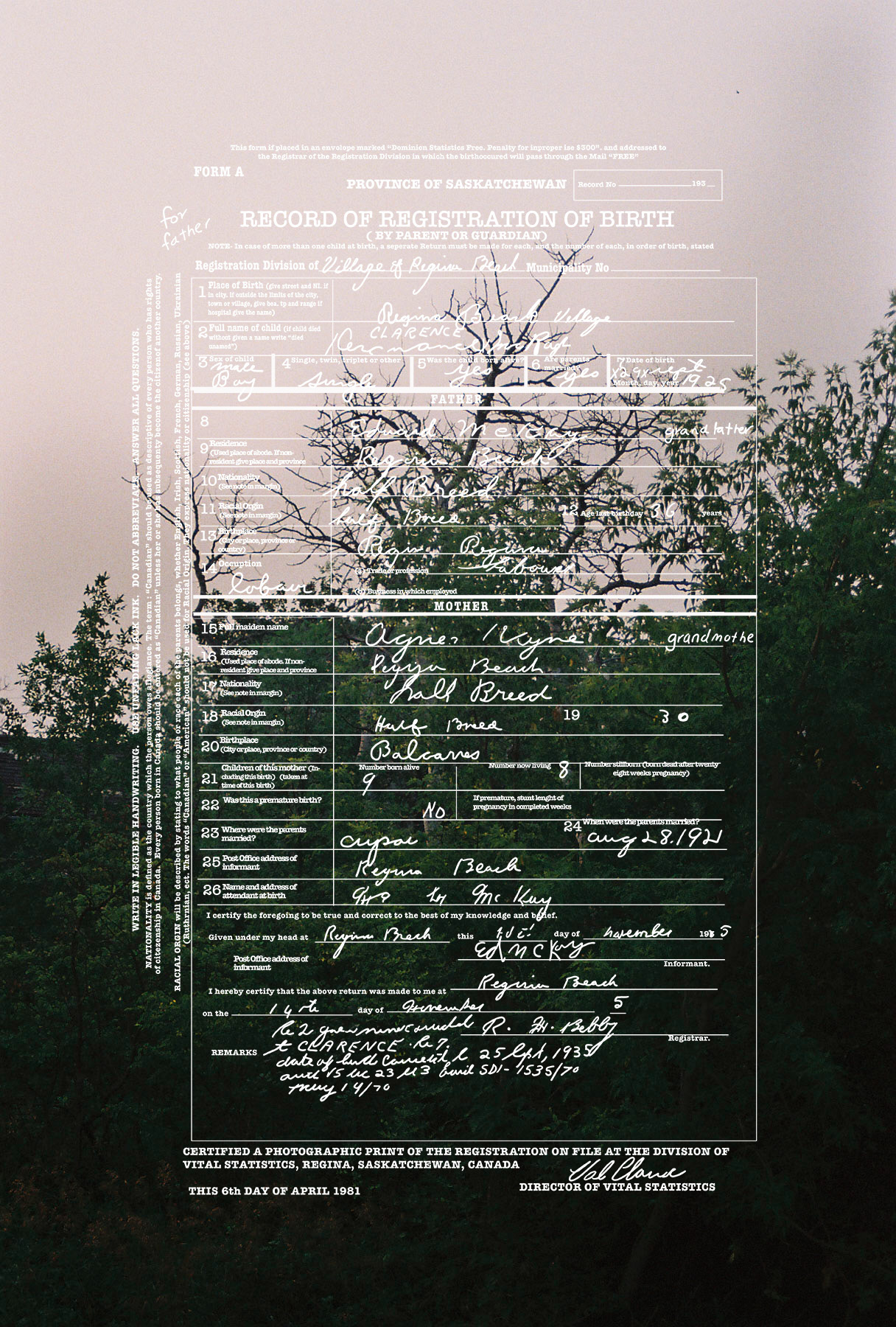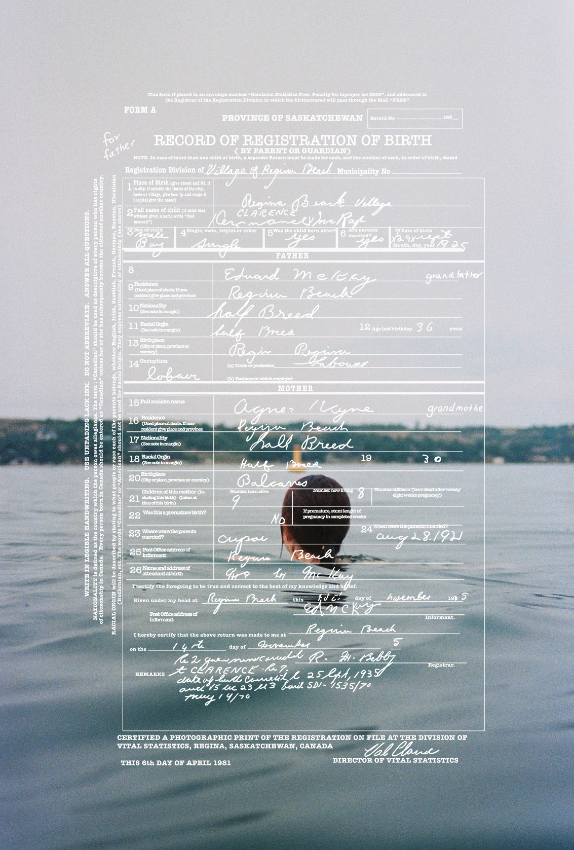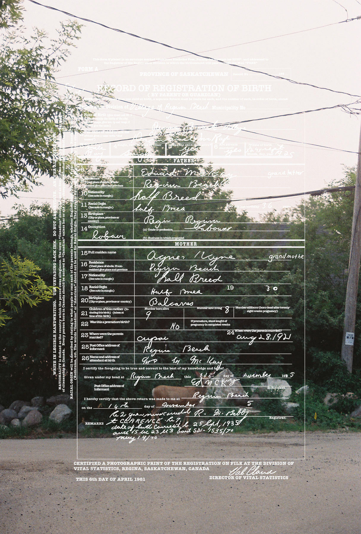 “I always knew I was Métis. I grew up with my dad making bannock, teaching us to paddle and even having my first buckskin coat made for me the second I was born. It wasn’t until during an artist residency at the Banff Centre, I researched my family history and traced my Métis ancestry to the Red River Settlement in Manitoba. Archival documents revealed that my great-grandparents were recorded using the colonial term ‘halfbreed’. For this work, I retrace my grandfather’s birth certificate, emphasizing the discriminatory language and digitally tracing it onto my photographs of Regina Beach, Saskatchewan where my family is from. This brings together an archive, a landscape, and my family history to confront the bureaucratic labeling of Indigenous identity. When applying for a gallery there is always a check box where it usually says in some sort of manner “are you Indigenous?” But if you just look at the work it tells you what I am… I’m a Halfbreed.”