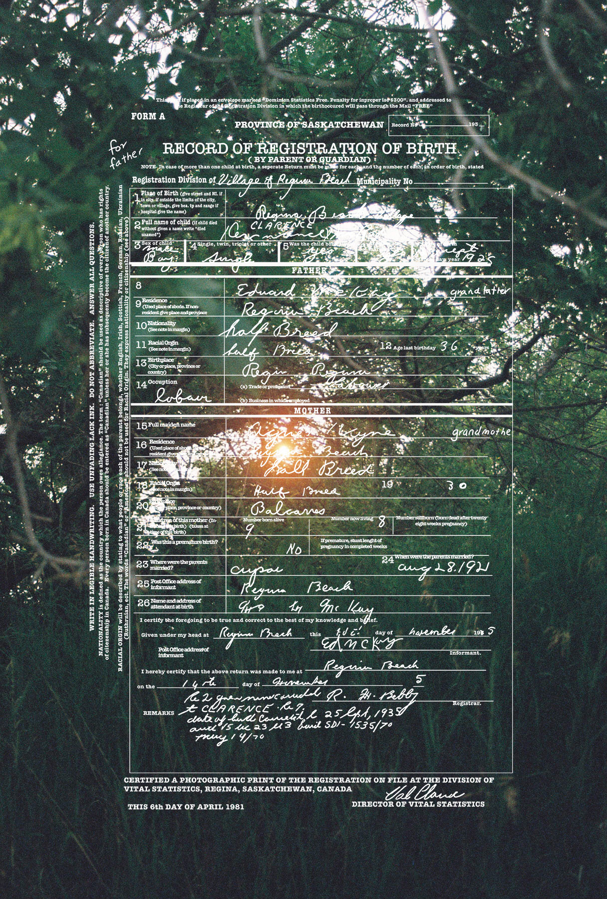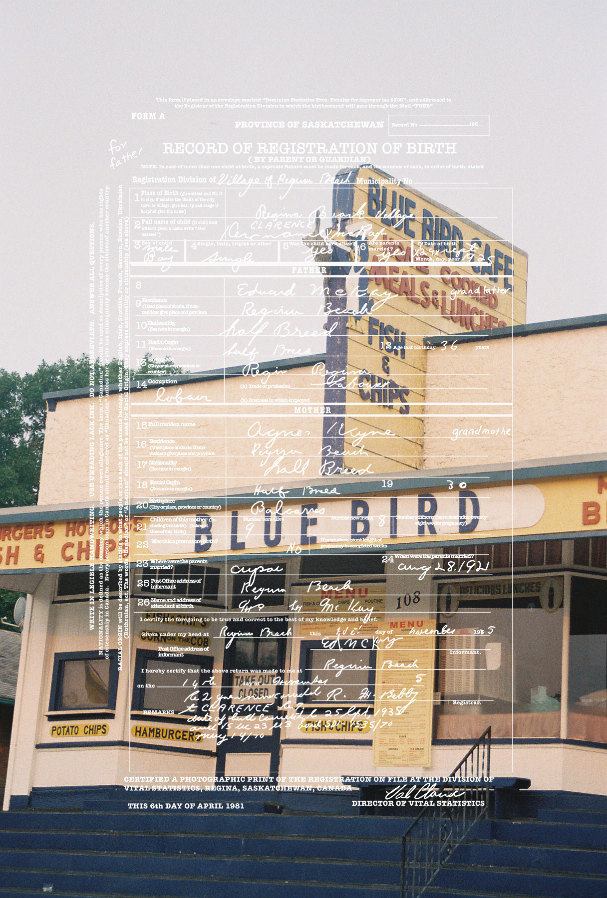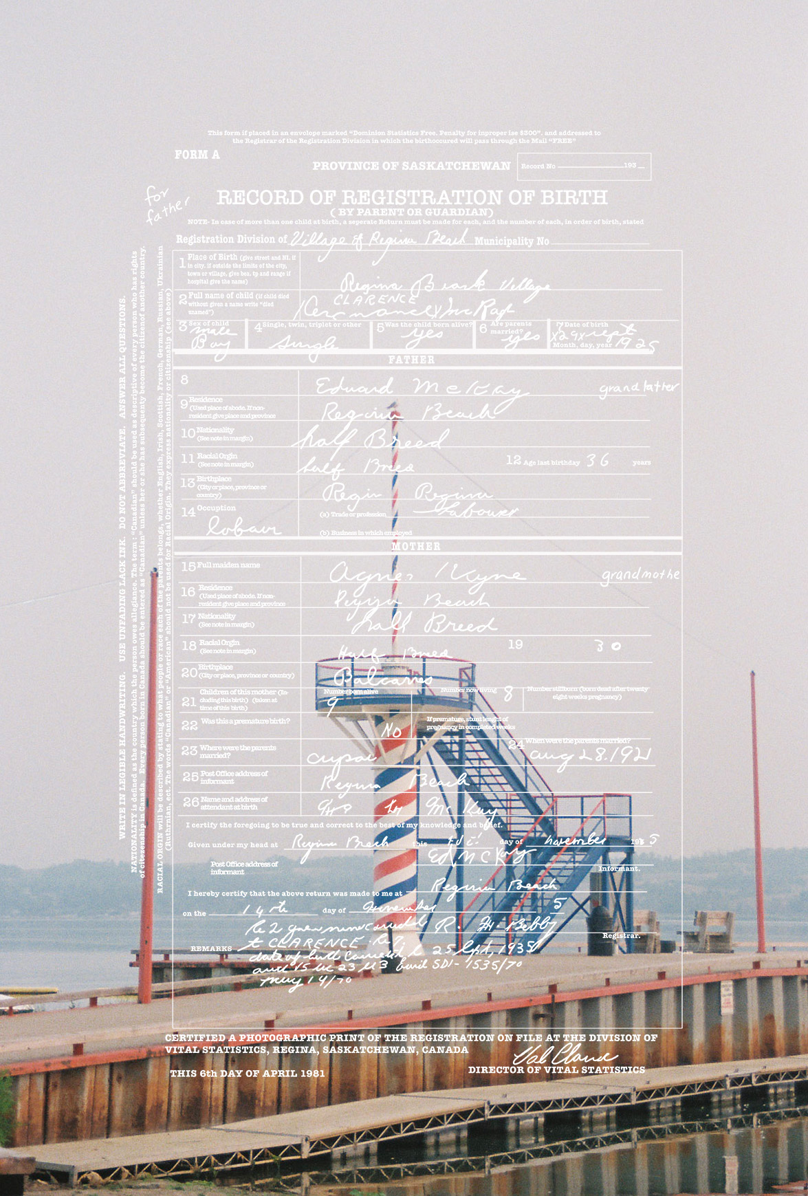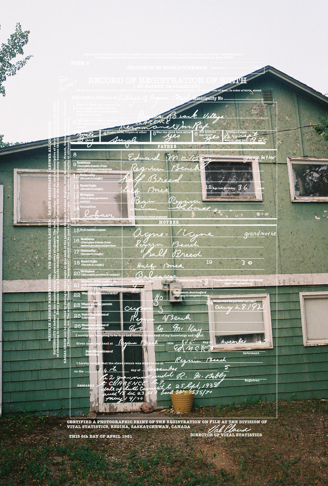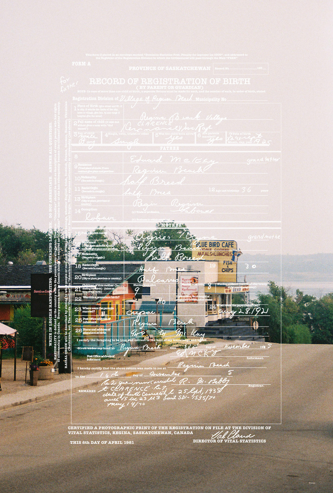 “I always knew I was Métis. I grew up with my dad making bannock, teaching us to paddle and even having my first buckskin coat made for me the second I was born. It wasn’t until during an artist residency at the Banff Centre, I researched my family history and traced my Métis ancestry to the Red River Settlement in Manitoba. Archival documents revealed that my great-grandparents were recorded using the colonial term ‘halfbreed’. For this work, I retrace my grandfather’s birth certificate, emphasizing the discriminatory language and digitally tracing it onto my photographs of Regina Beach, Saskatchewan where my family is from. This brings together an archive, a landscape, and my family history to confront the bureaucratic labeling of Indigenous identity. When applying for a gallery there is always a check box where it usually says in some sort of manner “are you Indigenous?” But if you just look at the work it tells you what I am… I’m a Halfbreed.”
