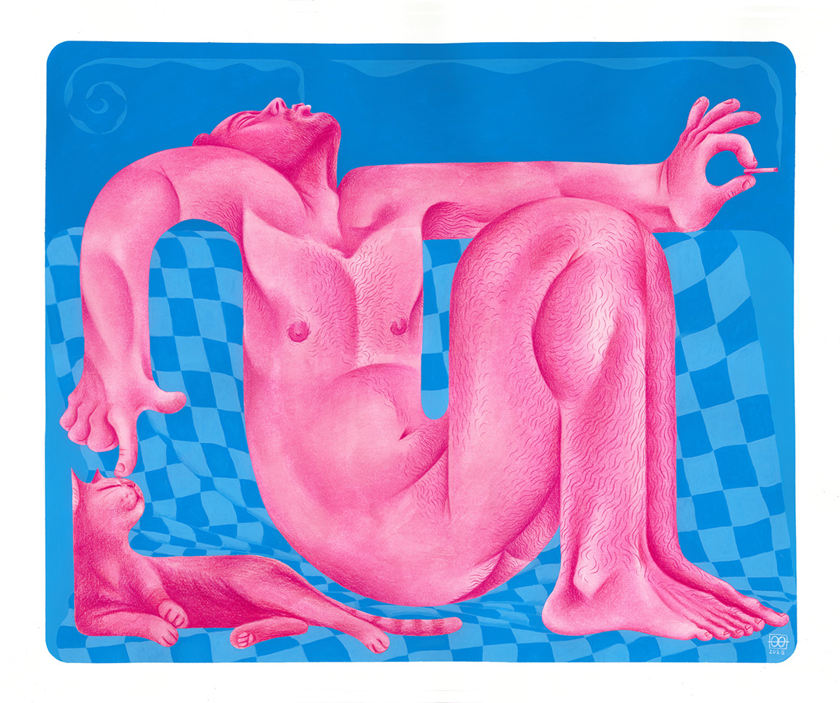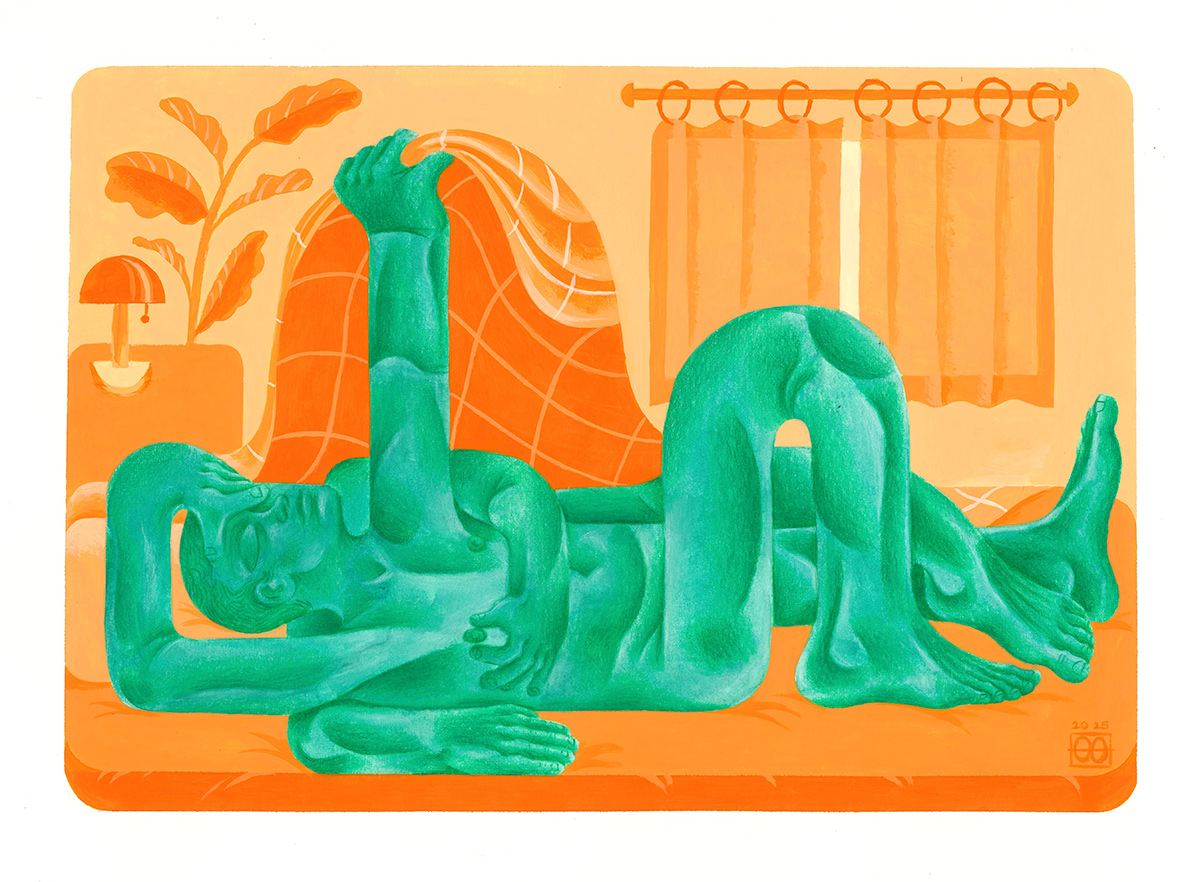 I am constantly inspired by Louis Fratino’s tender paintings, by Morteza Khakshoor’s sculptural approach to figuration, and I recently fell in love with Kevin Sabo’s bold and edgy characters. Inspiration for my work comes from my community, my husband, and most often, moments of my own daily routines and rituals.