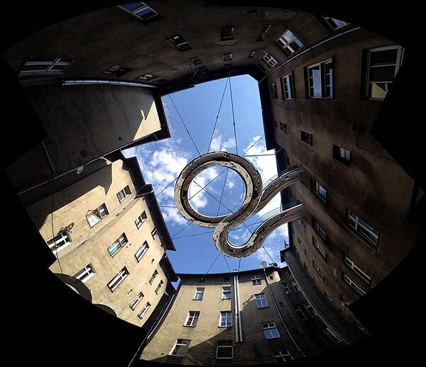 Grass-Covered Path Suspended Above Courtyard in Poland