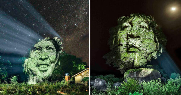 Faces of Indigenous Brazilians Projected onto Rainforest