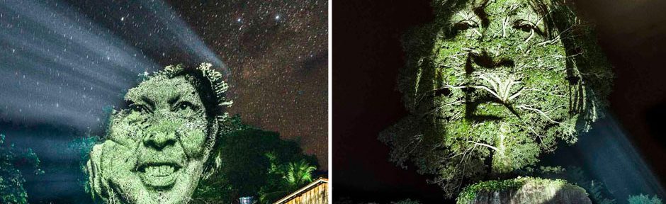 Faces of Indigenous Brazilians Projected onto Rainforest